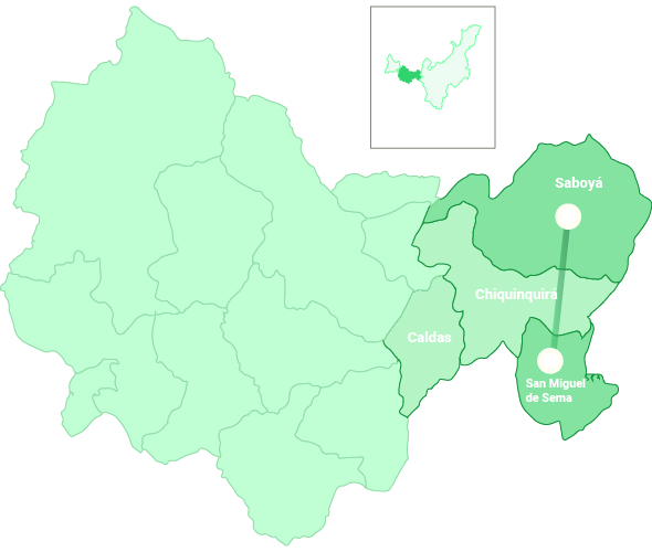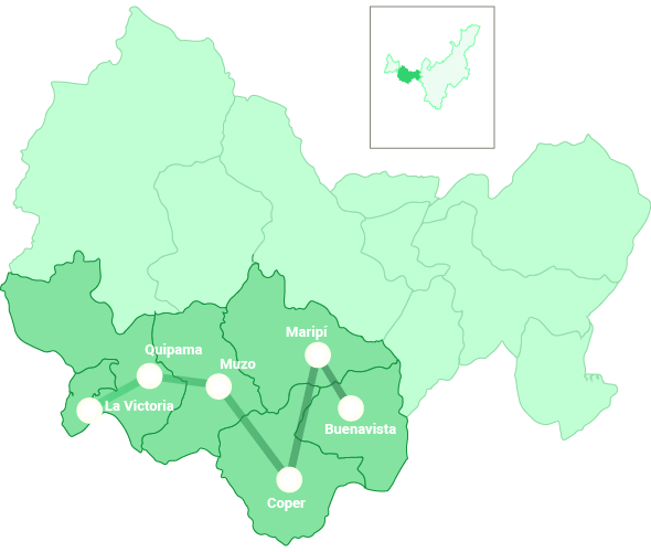 El segundo corredor conecta a los municipios de La Victoria, Quípama, Muzo, Coper, Maripí y Buenavista. Rodeados de las aguas de las cuencas de los ríos Minero y Chirche.